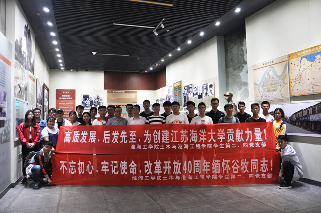 2018年正直改革开放四十周年,5月27日下午,在连云港市革命纪念馆,土木与港海工程学院举办以不忘初心,牢记使命,改革开放40周年缅怀谷牧同志;高质发展,后发先至,为创建江苏海洋大学贡献力量为主题的最佳党日活动。学院党委书记吴建新、学生第二党支部、第四党支部全体党员参加,活动由学生第二党支部书记郭利主持。